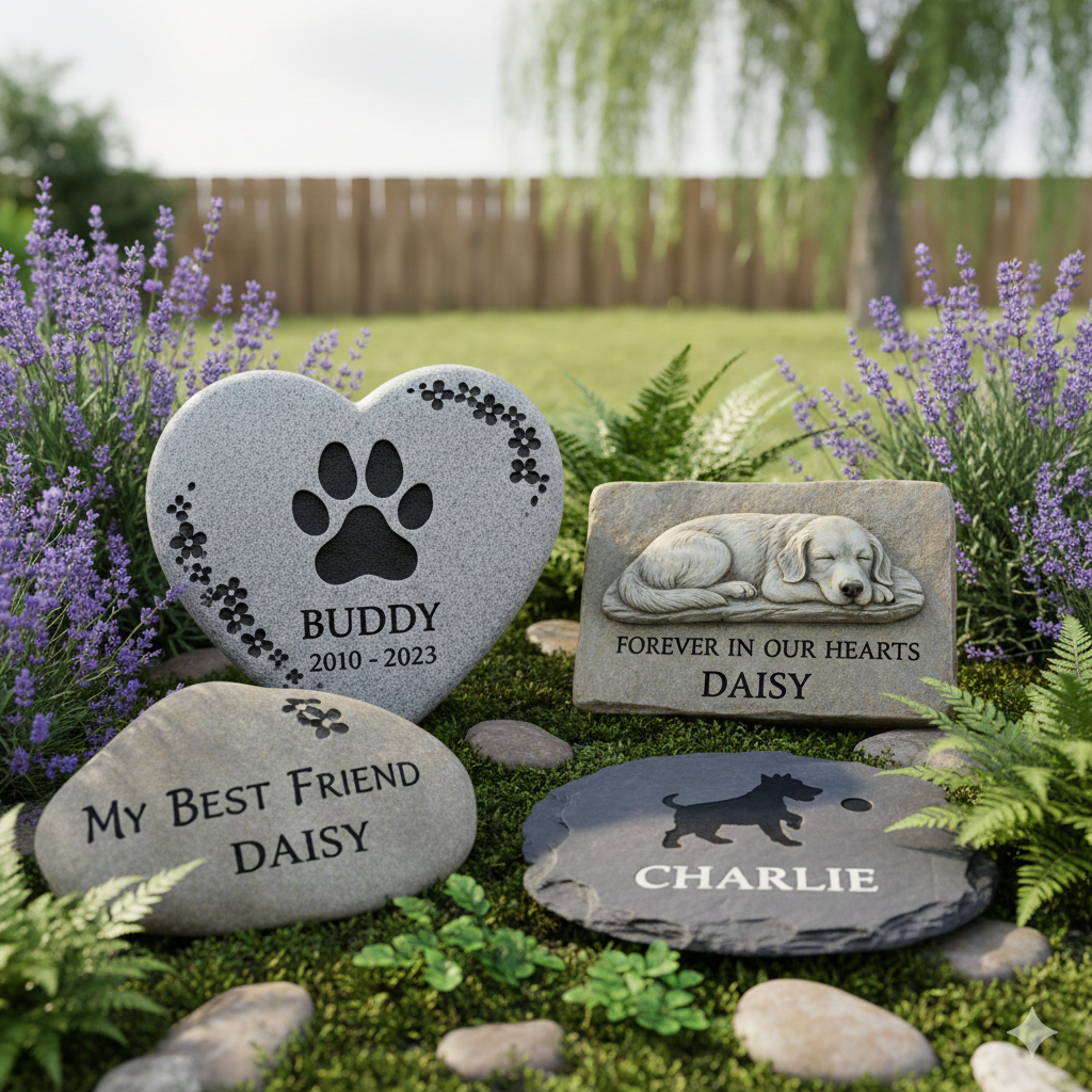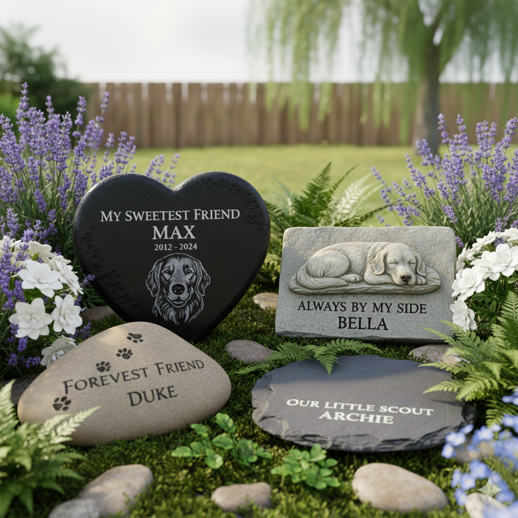 • Engraved Memorial Stones: Customized with your dog’s name, dates, and a heartfelt message.